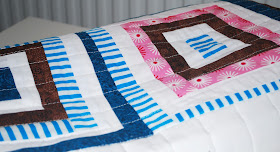 Fyra wonky blocks i en rad. Det var här det började. Hittade en bra beskrivning här hur man gör, ville testa och ursprungsidén var att göra grytlappar, men sen växte iden och så blev det tillslut ett täcke istället.Kantbandade med ett turkost prickigt tyg. Även kantbandandet gick smidigt, gjorde det dock inte för hand utan på maskin. Har som sagt inget stort tålamod.