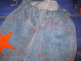 Jag sydde fast en stjärna som applikation på båda pojkarnas byxor bakpå. Storebror fick en i rött och lillebror i orange. (Har även använt tråd till alla synliga sömmar i samma färg.)