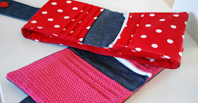 Jag valde att sy båda i jeans tyget som blev över från mina muddbrallor, och sen ha rött vs. rosa inuti.